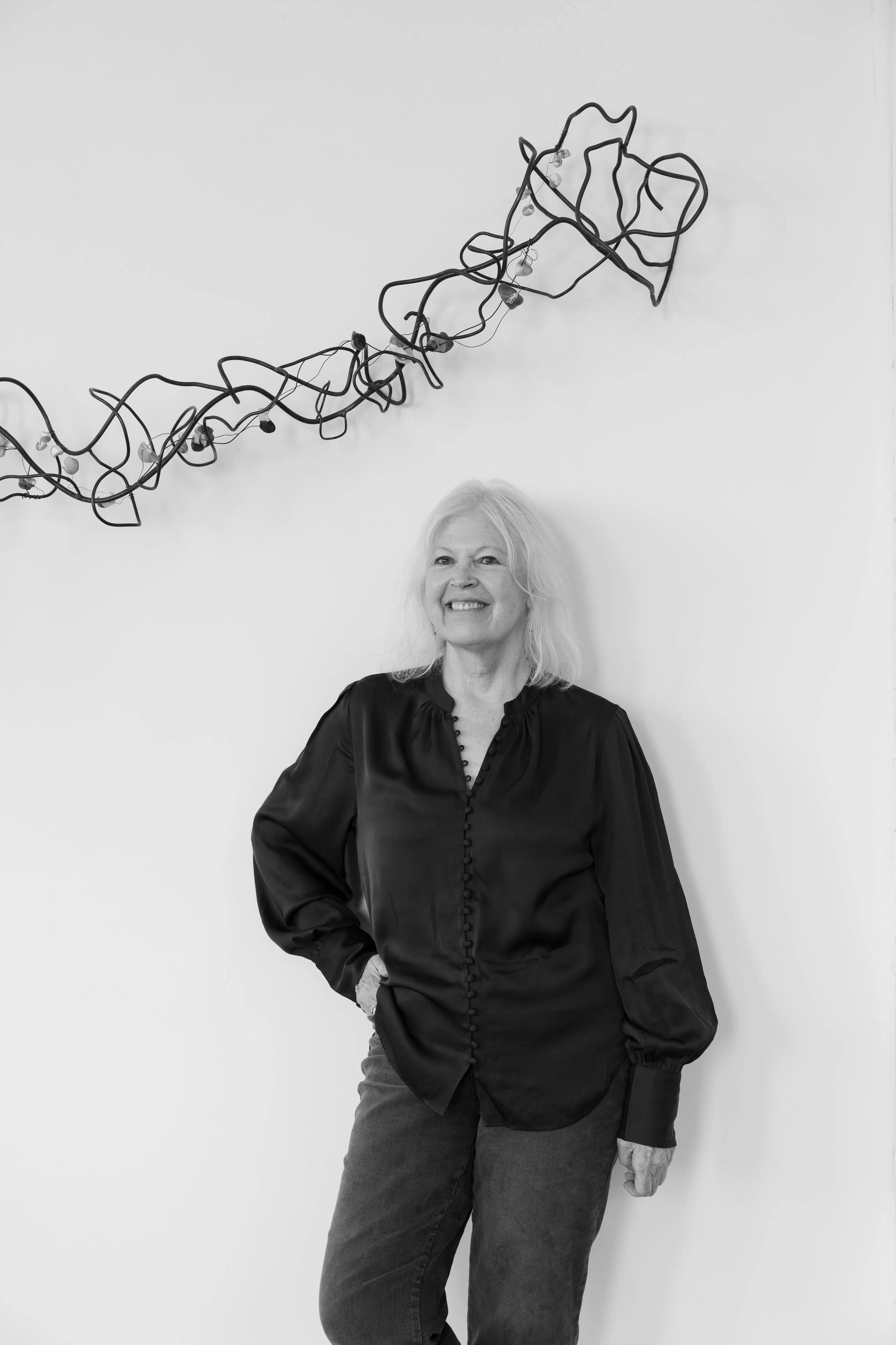 My sculptures begin with straight, round steel rods of varying thicknesses. The steel is bent, curved and welded in an entirely intuitive process to build form using the primal elements of heat and fire from an oxy-acetylene torch. The heating, bending and welding process is repeated until the form is complete and there appears to be no beginning or end to the lines. The resulting pieces appear light and organic but they have the weight of steel.